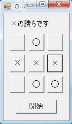 「開始」ボタンでゲームをスタートし、 9個のボタンをクリックするとその場所に交互に○と×を置きます。